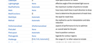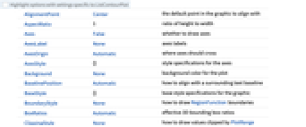 {colx,coly,colz} 绘制 z 列与 x 列和 y 列的对比图 {{colx1,coly1,colz1},{colx2,coly2,colz2},…} 绘制列 z1 与列 x1 和列 y1 的对比图,绘制列 z2 与列 x2 和列 y2 的对比图等 - ListContourPlot 的可选项与 Graphics 一样,可以有以下补充和修改: [所有选项的列表]