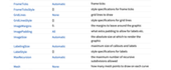 Annotation[fi,label] fiの注釈を与える Button[fi,action] fiの曲線がクリックされたときに action を評価する Callout[fi,label] コールアウトで関数にラベルを付ける Callout[fi,label,pos] コールアウトを相対的な位置 pos に置く EventHandler[fi,events] fiの一般的なイベントハンドラを定義する Highlighted[fi,effect] 効果を付けて fiを動的にハイライトする Highlighted[fi,Placed[effect,pos]] 位置 pos で効果を付けて fiを静的にハイライトする Hyperlink[fi,uri] 関数をハイパーリンクにする Labeled[fi,label] 関数にラベル付ける Labeled[fi,label,pos] ラベルを相対的な位置 pos に置く Legended[fi,label] 凡例中で関数を特定する PopupWindow[fi,cont] 関数にポップアップウィンドウを付ける StatusArea[fi,label] マウスオーバーの際にステータスエリアに表示する Style[fi,styles] 指定のスタイルで関数を表示する Tooltip[fi,label] 関数にツールチップを付ける Tooltip[fi] 関数をツールチップとして使う - ラッパー w は複数のレベルに適用することができる.