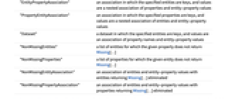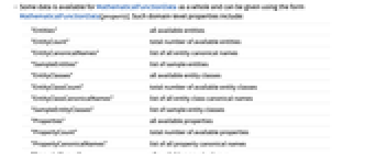 "EntityAssociation" 实体和实体-属性值的关联 "PropertyAssociation" 属性和实体-属性值的关联 "EntityPropertyAssociation" 一个关联,其中,指定的实体是键,值是属性和实体-属性值的嵌套关联 "PropertyEntityAssociation" 一个关联,其中,指定的属性是键,值是实体和实体-属性值的嵌套关联 "Dataset" 一个数据集,指定的实体是键,值是属性名称和实体-属性值的关联 "NonMissingEntities" 实体列表,其中,给定属性不返回 Missing[…] "NonMissingProperties" 给定属性不会返回 Missing[…] 的实体列表 "NonMissingEntityAssociation" 实体和实体-属性值的关联,其中,返回 Missing[…] 的实体被消除 "NonMissingPropertyAssociation" 实体和实体-属性值的关联,其中,返回 Missing[…] 的属性被消除  - MathematicalFunctionData[EntityProperty[…],subproperty] 可用于查询属性元数据. 可用于第二个参数的可用元数据字符串为: