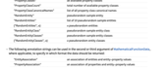 "Entities" 所有可用实体 "EntityCount" 可用实体的总数 "EntityCanonicalNames" 所有实体的标准名称列表 "SampleEntities" 样本实体列表 "EntityClasses" 所有可用实体类别 "EntityClassCount" 可用实体类别的总数 "EntityClassCanonicalNames" 所有实体类别的标准名称列表 "SampleEntityClasses" 样本实体类别列表 "Properties" 所有可用属性 "PropertyCount" 可用属性的总数 "PropertyCanonicalNames" 所有属性的标准名称列表 "PropertyClasses" 所有可用属性类别 "PropertyClassCount" 可用属性类别的总数 "PropertyClassCanonicalNames" 所有属性类别的标准名称列表 "RandomEntity" 伪随机样本实体 "RandomEntities" 10 个伪随机样本实体列表 {"RandomEntities",n} n 个伪随机实体 "RandomEntityClass" 伪随机样本实体类别 "RandomEntityClasses" 多个伪随机样本实体类别 {"RandomEntityClasses",n} n 个伪随机实体类别  - 当适用时,以下注释字符串可用于 MathematicalFunctionData 的第二或第三参数,指定应以何种格式返回数据: