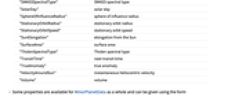 "PeriapsisTime" 次の近点時 "PeriapsisTimeLast" 直前の近点時 "Perihelion" 太陽からの最短距離 "PolarDiameter" 極直径 "PolarRadius" 極半径 "ProvisionalDesignation" 暫定指定 "Radius" 平均半径 "RetrogradeApparentMotionQuery" 見かけの方向 "RightAscension" 赤経 "RiseTime" 次の出 "RocheLimit" ロッシュ限界 "RotationalAngularMomentum" 回転角運動量 "RotationPeriod" 回転周期 "Satellites" 既知の衛星 "SemimajorAxis" 長半径 "SemiminorAxis" 短半径 "SetTime" 次の入 "Shape" 形 "SiderealHourAngle" 恒星時角 "SlopeParameter" 勾配パラメータの大きさ "SMASSSpectralType" SMASSスペクトルタイプ "SolarDay" 太陽日 "SphereOfInfluenceRadius" 影響半径の球 "StationaryOrbitRadius" 静止軌道半径 "StationaryOrbitSpeed" 静止軌道速度 "SunElongation" 太陽からの離隔 "SurfaceArea" 表面積 "TholenSpectralType" Tholenスペクトルタイプ "TransitTime" 次の子午線通過時 "TrueAnomaly" 真近点 "VelocityAroundSun" 瞬間日心速度 "Volume" 体積 - 特性の中には全体としてMinorPlanetDataに使え,MinorPlanetData[property]の形を使って与えられるものがある.次はそのような特性である.