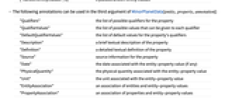 "Qualifiers" 特性の可能な限定子のリスト "QualifierValues" 各限定子に与えることができる値のリスト "DefaultQualifierValues" 特性の限定子のデフォルト値のリスト "Description" 特性のテキストによる簡単な説明 "Definition" 特性のテキストによる詳細な定義 "Source" 特性の出典情報 "Date" 実体と特性のペアの値があれば,それに関連した日付 "PhysicalQuantity" 実体と特性のペアの値に関連した物理量 "Unit" 実体と特性のペアの値に関連した単位 "EntityAssociation" 実体および実体と特性のペアの値の連想 "PropertyAssociation" 特性および実体と特性のペアの値の連想 - 関数が annotation として与えられている場合,これは結果のデータを集約するのに使われる.次はよく使われる集約関数である.