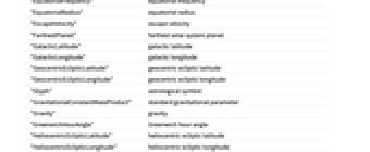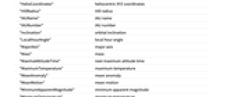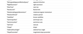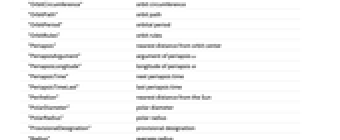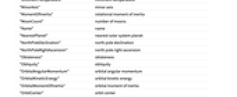 "AbsoluteMagnitudeH" 絶対等級H "Age" 年齢 "Albedo" アルベド "AlphanumericName" 英数字による名前 "AlternateNames" 別名 "Altitude" 高度 "AltitudeMaximum" 次の最大高度 "AltitudeTransit" 次の子午線通過高度 "AngularDiameterFromEarth" 地球から見える角直径 "AngularRadiusFromEarth" 地球から見える角半径 "Aphelion" 太陽からの最大距離 "Apoapsis" 軌道の中心からの最大距離 "ApoapsisTime" 次の軌道遠点時 "ApoapsisTimeLast" 直前の軌道遠点時 "ApparentAltitude" 視高度 "ApparentMagnitude" 視等級 "AscendingNodeLongitude" 昇交点 の経度