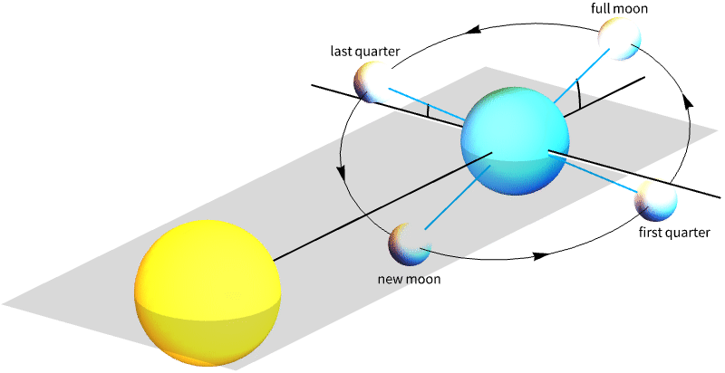 - 月相は月と太陽の間の角度を説明するもので,地球から観察される月の見かけの形を決定する.