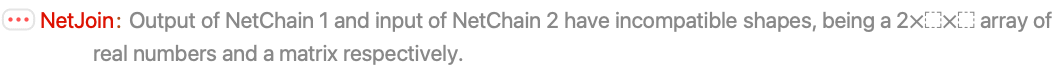 - NetJoin[net1,net2,…,"port"->spec,…] can be used to specify types for the input and/or output of the resulting NetChain or NetGraph, using the normal type specifications allowed by NetGraph. The new port specifications will replace any existing NetEncoder, NetDecoder or type.