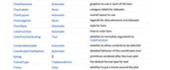 - 从 BarChart 中选项和其它结构得到的样式和其它规范实际上以如下顺序应用:ChartStyle、ColorFunction、Style 和其它封装、ChartElements 和 ChartElementFunction,其中后面的规范覆盖前面的.