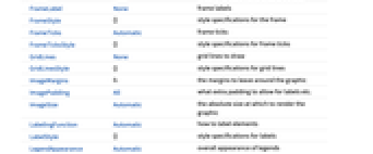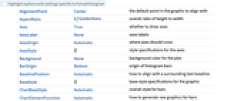 AspectRatio 1/GoldenRatio 高度和宽度的整体比例 Axes True 是否绘制轴 BarOrigin Bottom 直方图中直方条的原点 ChartBaseStyle Automatic 直方条的整体样式 ChartElementFunction Automatic 如何生成直方条的原始图形 ChartElements Automatic 每个直方条使用的图形 ChartLabels None 数据集的类别标签 ChartLayout Automatic 使用整体布局 ChartLegends None 直方条的样式 ChartStyle Automatic 数据元素和数据集的图例 ColorFunction Automatic 如何对直方条进行着色 ColorFunctionScaling True 是否将 ColorFunction 的参数归一化 LabelingFunction Automatic 如何对元素添加标签 LegendAppearance Automatic 图例的整体外观 PerformanceGoal $PerformanceGoal 优化的目标 PlotTheme $PlotTheme 直方图的整体主题 ScalingFunctions None 如何对单个坐标进行缩放 TargetUnits Automatic 在图表中显示的单位 - ChartLayout 的以下设置可用于显示多个数据集: