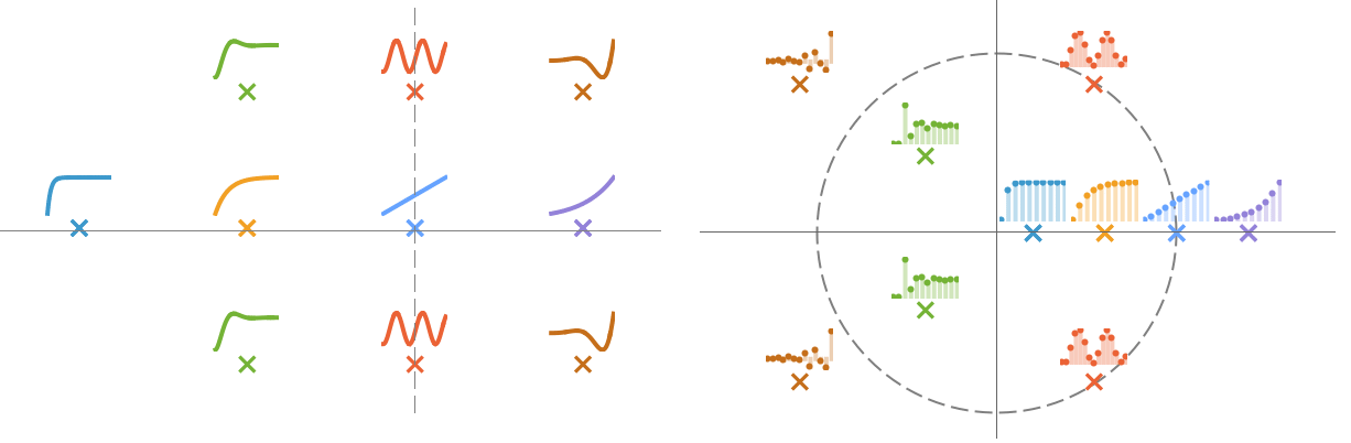The first pair of poles and eigenvectors generates the exponentially decaying oscillatory mode: