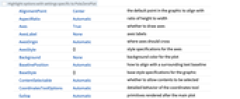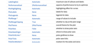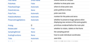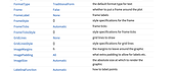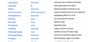Axes True whether to draw axes Epilog Automatic primitives rendered after the main plot LabelingFunction Automatic how to label points LabelingSize Automatic maximum size of callouts and labels PerformanceGoal $PerformanceGoal aspects of performance to try to optimize PlotHighlighting Automatic highlighting effect for curves PlotLabels None labels for data PlotLegends None legends for data PlotRange Automatic range of values to include PlotRangeClipping True whether to clip at the plot range PlotTheme $PlotTheme overall theme for the plot PolarAxes False whether to draw polar axes PolarAxesOrigin Automatic where to draw polar axes PolarGridLines None polar gridlines to draw PolarTicks Automatic polar axes ticks PoleZeroMarkers Automatic markers for the poles and zeros SamplingPeriod None the sampling period ScalingFunctions None how to scale individual coordinates