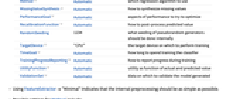 AnomalyDetector None 予測器が使う異常検出器 AcceptanceThreshold Automatic 異常検出器の稀少確率閾値 FeatureExtractor Identity 学習対象となる特徴をどのように抽出するか FeatureNames Automatic 入力データに割り当てる特徴の名前 FeatureTypes Automatic 入力データに仮定する特徴タイプ IndeterminateThreshold 0 どの確率密度より下でIndeterminateを返すか Method Automatic 使用する回帰アルゴリズム MissingValueSynthesis Automatic 欠測値の合成方法 PerformanceGoal Automatic パフォーマンスのどの面について最適化するか RecalibrationFunction Automatic 予測された値をどのように後処理するか RandomSeeding 1234 どのような擬似乱数生成器のシードを内部的に使うべきか TargetDevice "CPU" そこで訓練を行うターゲットデバイス TimeGoal Automatic 分類器の訓練にどのくらい時間をかけるか TrainingProgressReporting Automatic 訓練中の進捗状況をどのようにレポートするか UtilityFunction Automatic 実測値/予測値の関数としての効用 ValidationSet Automatic 生成されたモデルを確かめるためのデータ - FeatureExtractor"Minimal"は内部の前処理を出来るだけ簡単にすべきであることを示す.