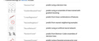 "DecisionTree" 決定木を使って予測する "GradientBoostedTrees" 勾配ブースティングで訓練した木の集合を使って予測する "LinearRegression" 特徴の線形結合から予測する "NearestNeighbors" 最近傍の例から予測する "NeuralNetwork" 人工の神経回路網を使って予測する "RandomForest" 決定木についてのBreimanおよびCutlerの集合体から予測する "GaussianProcess" ガウス過程の事前分布を関数に使って予測する - 次は,PerformanceGoalの可能な設定値である.