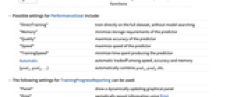 "DirectTraining" モデルを検索することなしに,直接データ集合全体について訓練する "Memory" 予測器の保存条件を最小にする "Quality" 予測器の確度を最大にする "Speed" 予測器の速度を最大にする "TrainingSpeed" 予測器の作成にかける時間を最小にする Automatic スピード,確度,メモリの自動トレードオフ {goal1,goal2,…} goal1,goal2等を自動的に組み合せる - TrainingProgressReportingの設定として以下を使うことができる.