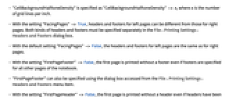- "FacingPages" -> Trueでは,左ページのヘッダとフッタは,右ページのヘッダとフッタと異なる.両方のヘッダとフッタは,「ファイル」▶「印刷設定」▶「ヘッダとフッタ」のダイアログボックスで別々に指定しなければならない.