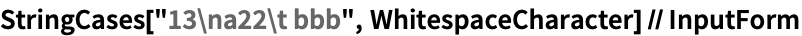 \\d digit 0–9 \\D nondigit \\s space, newline, tab, or other whitespace character \\S non-whitespace character \\w word character (letter, digit, or _) \\W nonword character [[:class:]] characters in a named class [^[:class:]] characters not in a named class - The following named classes can be used: alnum, alpha, ascii, blank, cntrl, digit, graph, lower, print, punct, space, upper, word, xdigit.