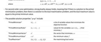 "ObjectiveVector" 线性目标向量 "SecondOrderConeConstraints" 约束条件的系数的列表 "LinearEqualityConstraints" 线性相等约束矩阵和向量 {"prop1","prop2",…} 解的几个属性 - 可以给出以下选项: