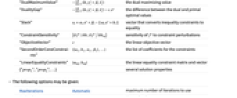 "PrimalMinimumValue" 最小值 "DualMaximizer" 最大对偶向量 "DualMaximumValue" 对偶最大值 "DualityGap" 对偶和原始优化值之差 "Slack" 把不等约束条件转换为等式的向量 "ConstraintSensitivity" 对约束扰动的敏感度