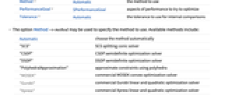 Automatic 自动选择方法 "SCS" SCS 分裂圆锥求解器 "CSDP" CSDP 半定优化求解器 "DSDP" DSDP 半定优化求解器 "PolyhedralApproximation" 使用多面体的近似约束 "MOSEK" 商用 MOSEK 凸优化求解器 "Gurobi" 商业 Gurobi 线性和二次优化求解器 "Xpress" 商业 Xpress 线性和二次优化求解器 - 计算受限于 MachinePrecision.