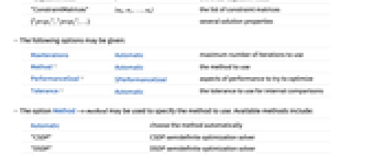 "ObjectiveVector" 線形目的ベクトル "ConstraintMatrices" 制約行列のリスト {"prop1","prop2",…} いくつかの解の特性 - 次は,使用可能なオプションである.