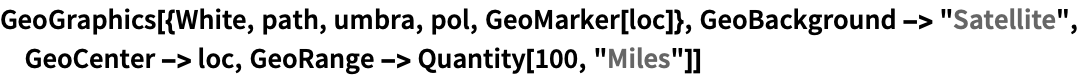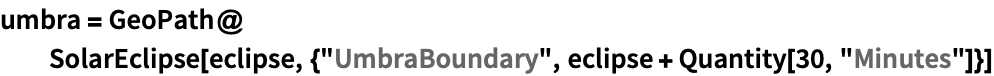 {"UmbraPolygon",date} polygon of the umbra shadow at the given date {"UmbraBoundaryLine",date} geo path of the boundary of the umbra at the given date "UmbraEnvelopePolygon" polygon including all locations in the umbra during the eclipse "UmbraRiseSetLine" rising and setting curve for the umbra {"UmbraPathWidth",date} width of the umbra envelope at the given date - The property "TotalPhasePolygon" is equivalent to "UmbraEnvelopePolygon".