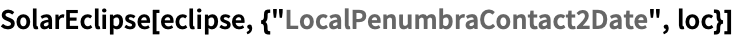 {"LocalPenumbraContact1Date",loc} instant of first penumbral contact with position loc {"LocalPenumbraContact2Date",loc} instant of last penumbral contact with position loc {"LocalPenumbraDuration",loc} duration between first and last penumbral contacts {"LocalUmbraContact1Date",loc} instant of first umbral contact with position loc {"LocalUmbraContact2Date",loc} instant of last umbral contact with position loc {"LocalUmbraDuration",loc} duration between first and last umbral contacts - Time- and location-dependent properties include: