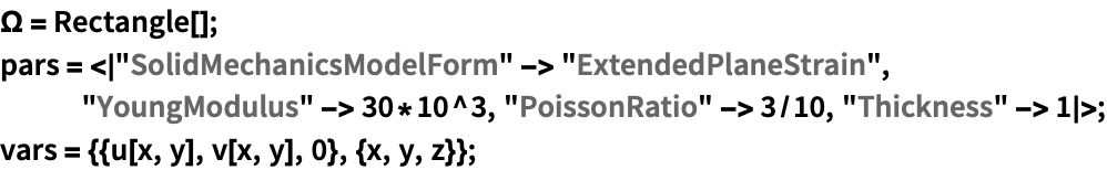 Compute a plane strain case as an extended model. This allows for the computation of the out-of-plane stress and verifies that the out-of-plane strain is 0. Set up the region, variables and parameters. The variables now include all three directions:
