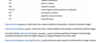 "M1" 磁偶极 "E2" 电四极 "M2" 磁四极 "E3" 电八极 "M3" 磁八极 "M1+E2" 磁偶极和电四极的混合 "2P" 双光子跃迁 "HF" 超精细受激跃迁 "UT" 未指定类型 - SpectralLineData[quantity,n] 会返回距指定量最近的 n 个实体. n 应为正整数.