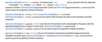 - SpectralLineData[<|"Element"->element,"IonizationLevel"->i,"PrincipalN"->n,"OrbitalL"->l,"SpinS"->s,"JValue"->j|>,"Entity"] 返回所有具有要求的量子数的能级. 可用 SpectralLineData[quantumnumbers] 和 SpectralLineData[quantumnumbers,property] 来查询这些跃迁的属性.