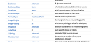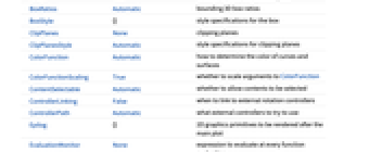 Axes True 軸を描くかどうか BoundaryStyle Automatic 曲面の境界線をどのように描くか ColorFunction Automatic 曲線と曲面の色をどのように決めるか ColorFunctionScaling True ColorFunctionの引数をスケールするかどうか EvaluationMonitor None 各関数を評価するときに評価する式 Exclusions Automatic 除外すべき