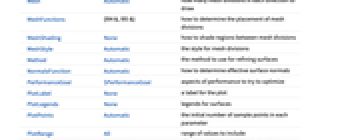 曲線ExclusionsStyle None 除外された点または曲線の部分に何を描くか MaxRecursion Automatic 許容する再帰分割の最大数 Mesh Automatic 各方向にいくつのメッシュ分割を描くか MeshFunctions {#4&,#5&} メッシュ分割の置き方をどう決めるか MeshShading None メッシュ分割間の陰影付けの方法 MeshStyle Automatic メッシュ分割のスタイル Method Automatic 曲面の細分化に使用するメソッド NormalsFunction Automatic 効果的な曲面の法線をどのように決定するか PerformanceGoal $PerformanceGoal パフォーマンスのどの面について最適化するか PlotLegends None 曲面の凡例 PlotPoints Automatic 各パラメータのサンプル点の最初の数 PlotStyle Automatic 各オブジェクトのスタイルに使うグラフィックス指示子 PlotTheme $PlotTheme プロットの全体的なテーマ RegionFunction (True&) 点を含めるかどうかの決定方法 ScalingFunctions None 個々の座標のスケール方法 TextureCoordinateFunction Automatic テクスチャ座標の決め方 TextureCoordinateScaling True TextureCoordinateFunctionの引数をスケールするかどうか WorkingPrecision MachinePrecision 内部計算の精度 - Tooltip,StatusArea,あるいはAnnotationを使って曲線や曲面にインタラクティブにラベルを付けることができる.