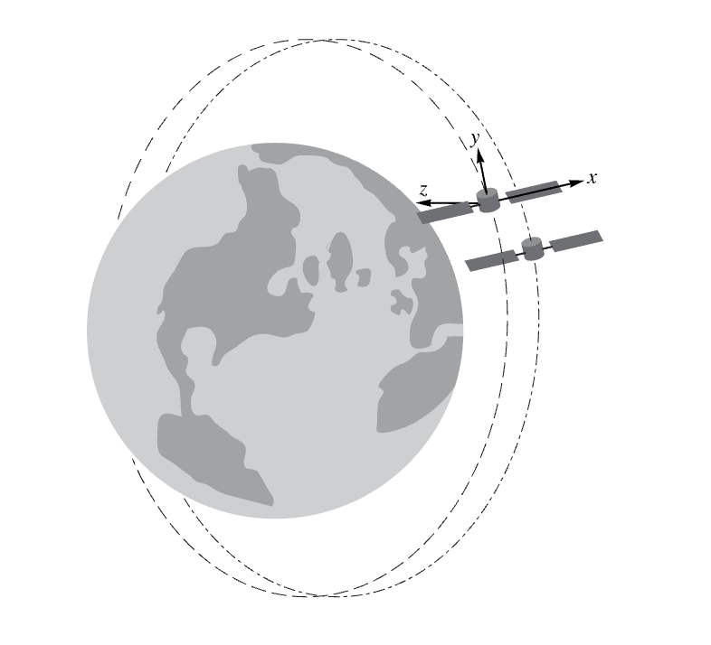 The Clohessy–Wiltshire equations model the relative motion between two satellites orbiting a central body:
