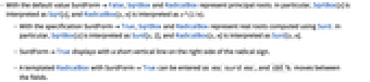 - デフォルト値のSurdFormFalseのとき,SqrtBoxおよびRadicalBoxは主根を表す.特に,SqrtBox[x]はSqrt[x]と解釈され,RadicalBox[x,n]はs x^(1/n)と解釈される.