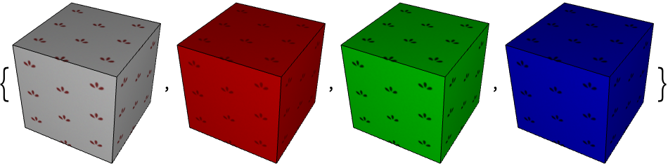 Texture[{c1,c2,…}] a 1D texture of colors Texture[{{c11,c12,…},…}] a 2D texture of colors Texture[{{{c111,c112,…},…},…}] a 3D texture of colors - Each color can be either a list of the form {r,g,b} corresponding to RGBColor[r,g,b] or a list of the form {r,g,b,a} corresponding to RGBColor[r,g,b,a].