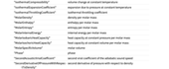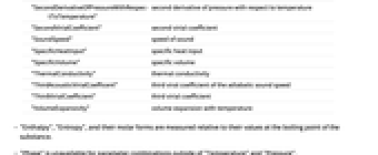 "AdiabaticBulkModulus" 断熱圧縮についての体積弾性率 "AdiabaticCompressibility" 定エントロピーでの体積変化率 "B12" 混合第2ビリアル係数 "ChemicalPotentials" 量の変化によるギブズ自由エネルギーの変化 "CompressibilityFactor" 理想気体の挙動からの補正係数 "Density" 密度 "DerivativeOfPressureWithRespectToDensityAndTemperature" 密度と温度についての圧力微分 "DielectricConstant" 誘電率と真空の誘電率の比 "DynamicViscosity" 粘度 "Enthalpy" エンタルピー "Entropy" エントロピー "ExcessEnergy" 理想と現実の内部エネルギーの差 "ExcessEnthalpy" 理想と現実のエンタルピーの差 "ExcessEntropy" 理想と現実のエントロピーの差 "ExcessGibbsFreeEnergy" 理想と現実のギブズの自由エネルギーの差 "ExcessHelmholtzFreeEnergy" 理想と現実のヘルムホルツの自由エネルギーの差 "ExcessVolume" 理想と現実の体積の差 "FirstDerivativeOfDensityWithRespectToPressure" 圧力についての密度微分 "FirstDerivativeOfDensityWithRespectToTemperature" 温度についての密度微分 "FirstDerivativeOfPressureWithRespectToDensity" 密度についての圧力微分 "FirstDerivativeOfPressureWithRespectToTemperature" 温度についての圧力微分 "FourthVirialCoefficient" 第4ビリアル係数 "GibbsFreeEnergy" ギブズの自由エネルギー "HelmholtzFreeEnergy" ヘルムホルツの自由エネルギー "InternalEnergy" 内部エネルギー "IsenthalpicJouleThomsonCoefficient" 定エンタルピーにおける圧力による温度変化 "IsentropicExpansionCoefficient" 比熱比 "IsobaricHeatCapacity" 定圧における熱容量 "IsochoricHeatCapacity" 定容積における熱容量 "IsothermalBulkModulus" 定温における体積弾性率 "IsothermalCompressibility" 定温における体積変化 "IsothermalExpansionCoefficient" 定温における圧力による膨張 "IsothermalThrottlingCoefficient" 等温絞り係数 "MolarDensity" 密度/モル容量 "MolarEnthalpy" エンタルピー/モル容量 "MolarEntropy" エントロピー/モル容量 "MolarInternalEnergy" 内部エネルギー/モル容量 "MolarIsobaricHeatCapacity" 定圧における熱容量/モル容量 "MolarIsochoricHeatCapacity" 定容積における熱容量/モル容量 "MolarSpecificVolume" モル容積 "Phase" 位相 "SecondAcousticVirialCoefficent" 断熱音速の第2ビリアル係数 "SecondDerivativeOfPressureWithRespectToDensity" 密度についての圧力の二次微分 "SecondDerivativeOfPressureWithRespectToTemperature" 温度についての圧力の二次微分 "SecondVirialCoefficient" 第2ビリアル係数 "SoundSpeed" 音速 "SpecificHeatInput" 比熱入力 "SpecificVolume" 比容積 "ThermalConductivity" 熱伝導率 "ThirdAcousticVirialCoefficent" 断熱音速の第3ビリアル係数 "ThirdVirialCoefficient" 第3ビリアル係数 "VolumeExpansivity" 温度による体積膨張 - "Enthalpy","Entropy",およびこれらのモル形式は物体の沸点におけるその値によって測られる.