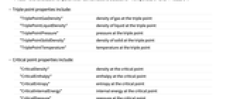"TriplePointGasDensity" 三重点における気体密度 "TriplePointLiquidDensity" 三重点における液体密度 "TriplePointPressure" 三重点における圧力 "TriplePointSolidDensity" 三重点における固体密度 "TriplePointTemperature" 三重点における温度 - 臨界点特性