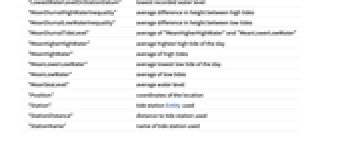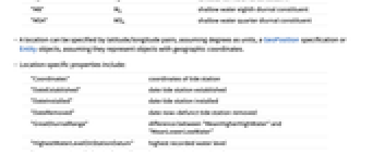 "Coordinates" 潮汐监测站的坐标 "DateEstablished" 潮汐监测站设立的日期 "DateInstalled" 潮汐监测站投入使用的日期 "DateRemoved" 已废弃潮汐监测站被移除的日期 "GreatDiurnalRange" "MeanHigherHighWater" 和 "MeanLowerLowWater" 之差 "HighestWaterLevelOnStationDatum" 有记录以来最高的水位 "LowestWaterLevelOnStationDatum" 有记录以来最低的水位 "MeanDiurnalHighWaterInequality" 满潮高度平均差 "MeanDiurnalLowWaterInequality" 干潮高度平均差 "MeanDiurnalTideLevel" "MeanHigherHighWater" 和 "MeanLowerLowWater" 的平均值 "MeanHigherHighWater" 日最大满潮平均值 "MeanHighWater" 满潮平均值 "MeanLowerLowWater" 日最低干潮平均值 "MeanLowWater" 干潮平均值 "MeanSeaLevel" 平均水位 "Position" 位置的坐标 "Station" 所用的潮汐监测站 Entity "StationDistance" 使用的到潮汐监测站的距离 "StationName" 所用的潮汐监测站的名字 - 计算出的属性包括: