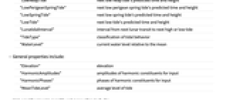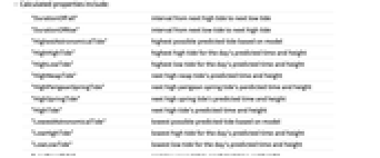 "DurationOfFall" 下一涨潮和下一退潮的间隔 "DurationOfRise" 下一退潮到下一涨潮的间隔 "HighestAstronomicalTide" 模型中最高可能预测的潮基 "HighHighTide" 预测的当天最大满潮出现的时间和高度 "HighLowTide" 当天预计的时间和高度的最高退潮 "HighNeapTide" 预测的下一个小潮的高点出现的时间和高度 "HighPerigeanSpringTide" 下一个高的 perigean 春潮的预测时间和高度 "HighSpringTide" 预测的下一个大潮的高点出现的时间和高度 "HighTide" 预测的下一个满潮出现的时间和高度 "LowestAstronomicalTide" 模型中最低的可能预测的潮基 "LowHighTide" 当天预计的时间和高度的最低涨潮 "LowLowTide" 预测的当天最低干潮出现的时间和高度 "LowNeapTide" 预测的下一个小潮的低点出现的时间和高度 "LowPerigeanSpringTide" 下一个低的 perigean 春潮的预测时间和高度 "LowSpringTide" 预测的下一个大潮的低点出现的时间和高度 "LowTide" 预测的下一个小潮出现的时间和高度 "LunatidalInterval" 下一个月中天到下一个涨潮或退潮的间隔 "TideType" 潮汐特性分类 "WaterLevel" 相对于平均值的当前水位 - 一般属性包括: