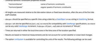 "Elevation" 海拔 "HarmonicAmplitudes" 输入的谐波成分的幅值 "HarmonicPhases" 输入的谐波成分的相位 "MeanTideLevel" 潮汐平均水位 - 谐波成分的共同属性包括: