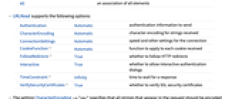 "Body" 文字列としての応答のボディ "BodyByteArray" バイト配列として応答の生のボディ "BodyBytes" バイト値のリストとしての応答の生のボディ "Headers" 応答で受信したヘッダのリスト "Cookies" 応答で受信したクッキーのリスト "ContentType" コンテントタイプヘッダ "StatusCode" サーバが返した状態コード "StatusCodeDescription" 状態コードのテキストでの説明 "Stream" 応答のボディを読むストリームオブジェクト {elem1,elem2,…} 要素 elemiの連想 Automatic 記号HTTPResponseオブジェクト All 全要素の連想 - URLReadは次のオプションをサポートする.