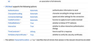 "Body" 字符串形式的响应的主体 "BodyByteArray" 字节数组形式的响应的原始主体 "BodyBytes" 字节值列表形式的响应的原始主体 "Headers" 响应中收到的标头的列表 "Cookies" 响应中收到的 cookie 的列表 "ContentType" 内容类型的标头 "StatusCode" 服务器返回的状态码 "StatusCodeDescription" 状态码的纯文本描述 "Stream" 读取响应主体的流对象 {elem1,elem2,…} 元素 elemi 的关联 Automatic 符号式 HTTPResponse 对象 All 所有元素的关联 - URLRead 支持下列选项: