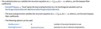 - WaveletPhi[wave,x,"Dual"]はBiorthogonalSplineWaveletやReverseBiorthogonalSplineWavelet等の双直交ウェーブレットの双対スケーリング関数