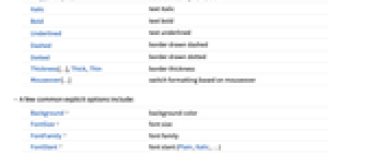 opt1val1,… 明确的选项 "class" 来自当前样式表的已命名类别名称 颜色指令 颜色 (Red、RGBColor[…]、…) 大小指令 大小 (width、{width,height}、…) InterfaceSwitched[…] 根据环境切换格式 Scaled[…] 相对于窗口大小的尺寸 Larger 较大的尺寸指定 Smaller 较小的尺寸指定 n (任意数字) n 个像素大小的尺寸 Tiny、Small 等 绝对大小指定 Italic 把文字变成斜体字 Bold 文字加粗 Underlined 在文字下面加下划线 Dashed 用虚线绘制边框 Dotted 用点线绘制边框 Thickness[…],Thick,Thin 边框的粗细 Mouseover[…] 鼠标悬停时切换格式 - 一些常见的明确选项包括:
