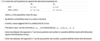 - ZTest[dspec,σ2,μ0,"HypothesisTestData"] 返回一个 HypothesisTestData 对象 htd,可以使用 htd["property"] 的形式来提取额外检验结果和属性.