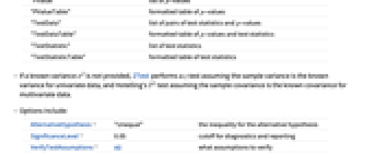 "TestStatistic" 检验统计量组成的列表 "TestStatisticTable" 检验统计量组成的格式化表格 - 如果已知的 σ2 值没有提供,则对于单变量数据,ZTest 假定样本方差为已知方差,执行