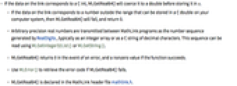 - リンク上のデータが,ユーザのコンピュータシステム上のC言語のdouble型で保持できる範囲を超える数字に対応するものであれば,MLGetReal64()は失敗し,0を返す.