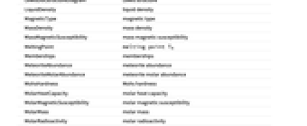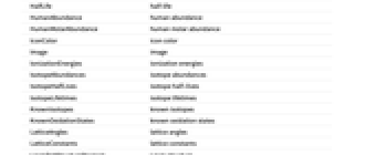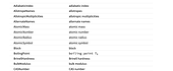 GasAtomicMultiplicities gas atomic multiplicities Group group HalfLife half‐life HumanAbundance human abundance HumanMolarAbundance human molar abundance IconColor icon color Image image IonizationEnergies ionization energies IsotopeAbundances isotope abundances IsotopeHalfLives isotope half-lives IsotopeLifetimes isotope lifetimes KnownIsotopes known isotopes KnownOxidationStates known oxidation states LatticeAngles lattice angles LatticeConstants lattice constants LewisDotStructureDiagram Lewis dot structure LiquidDensity liquid density MagneticType magnetic type MassDensity mass density MassMagneticSusceptibility mass magnetic susceptibility MeltingPoint