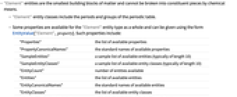 "Properties" 使用できる特性のリスト "PropertyCanonicalNames" 使用できる特性の標準名 "SampleEntities" 使用できる実体のサンプルリスト(通常の長さは10) "SampleEntityClasses" 使用できる実体クラスのサンプルリスト(通常の長さは10) "EntityCount" 使用できる実体の数 "Entities" 使用できる実体のリスト "EntityCanonicalNames" 使用できる実体の標準名 "EntityClasses" 使用できる実体クラスのリスト "EntityClassCanonicalNames" 使用できる実体クラスの標準名 "PropertyClasses" 使用できる特性クラスのリスト "PropertyClassCanonicalNames" 使用できる特性クラスの標準名 "PropertyCount" 使用できる特性の数 - EntityValue["Element",property,annotation]の第3引数として以下の注釈が使える.