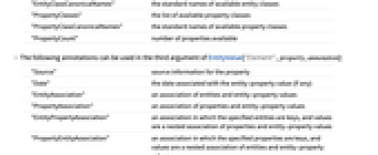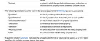 "Qualifiers" 特性の可能な限定子のリスト "QualifierValues" 各限定子に与えることができる値のリスト "DefaultQualifierValues" 特性の限定子のデフォルト値のリスト "Description" 特性についての短いテキストでの説明 "Definition" テキストでの特性についての詳しい説明 "PhysicalQuantity" 実体特性値に関連する物理量 "Unit" 実体特性値に関連する単位 - 限定子の値であるAutomaticは,適用できる形式の値が使えることを意味する.例えば,"Date"限定子には固有の日付や日付範囲が含まれる.