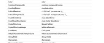BrinellHardness Brinell hardness BulkModulus bulk modulus CASNumber CAS number Color color CommonCompounds common compound names CovalentRadius covalent radius CriticalPressure