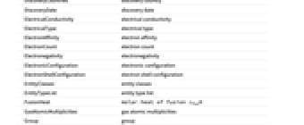 CrustAbundance crust abundance CrustMolarAbundance crust molar abundance CrystalStructure Bravais lattice CrystalStructureImage lattice schematic CuriePoint Curie point DebyeCharacteristicTemperature Debye characteristic temperature DecayMode decay mode Discoverers discoverers DiscoveryCountries discovery country DiscoveryDate discovery date ElectricalConductivity electrical conductivity ElectricalType electrical type ElectronAffinity electron affinity ElectronCount electron count Electronegativity electronegativity ElectronicConfiguration electronic configuration ElectronShellConfiguration electron shell configuration EntityClasses entity classes EntityTypeList entity type list FusionHeat