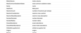 Memberships memberships MeteoriteAbundance meteorite abundance MeteoriteMolarAbundance meteorite molar abundance MohsHardness Mohs hardness MolarHeatCapacity molar heat capacity MolarMagneticSusceptibility molar magnetic susceptibility MolarMass molar mass MolarRadioactivity molar radioactivity MolarVolume molar volume MostCommonOxidationStates most common oxidation states Name name NeelPoint Néel point NeutronCount number of neutrons per isotope NeutronCrossSection neutron cross-section NeutronMassAbsorption neutron mass absorption NuclearDiameter nuclear diameter NuclearRadius nuclear radius OceanAbundance ocean abundance OceanMolarAbundance ocean molar abundance OrbitalOccupationList orbital occupation list Origins origins Period period Phase phase at STP PoissonRatio Poisson ratio Price price ProtonCount proton count RefractiveIndex refractive index Resistivity resistivity Series series ShearModulus shear modulus ShortElectronicConfiguration short electronic configuration SolarAbundance solar abundance SolarMolarAbundance solar molar abundance SolidificationHeat molar heat of solidification SoundSpeed sound speed SpaceGroup space group SpaceGroupNumber IUCr space group number SpecificFusionHeat